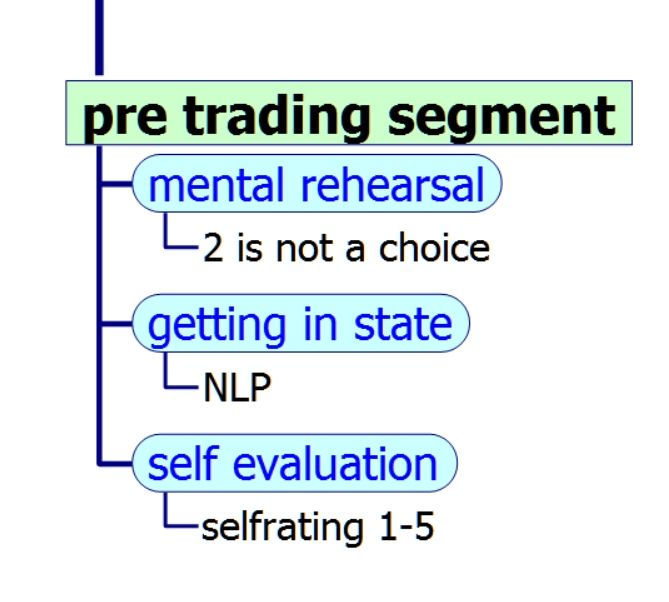 It is also important to have a daily self rating methodology to trade proper size/risk not only based on specific money management rules but to compensate for the fact that one can't be a 100% each day.Fighting with a spouse and kicking the dog will not be followed by a usual trading day as such trade size and or frequency reduction is imperative especially also after loosing or winning streaks and when markets raise questions in times them behaving in a unusual way to ones experience level