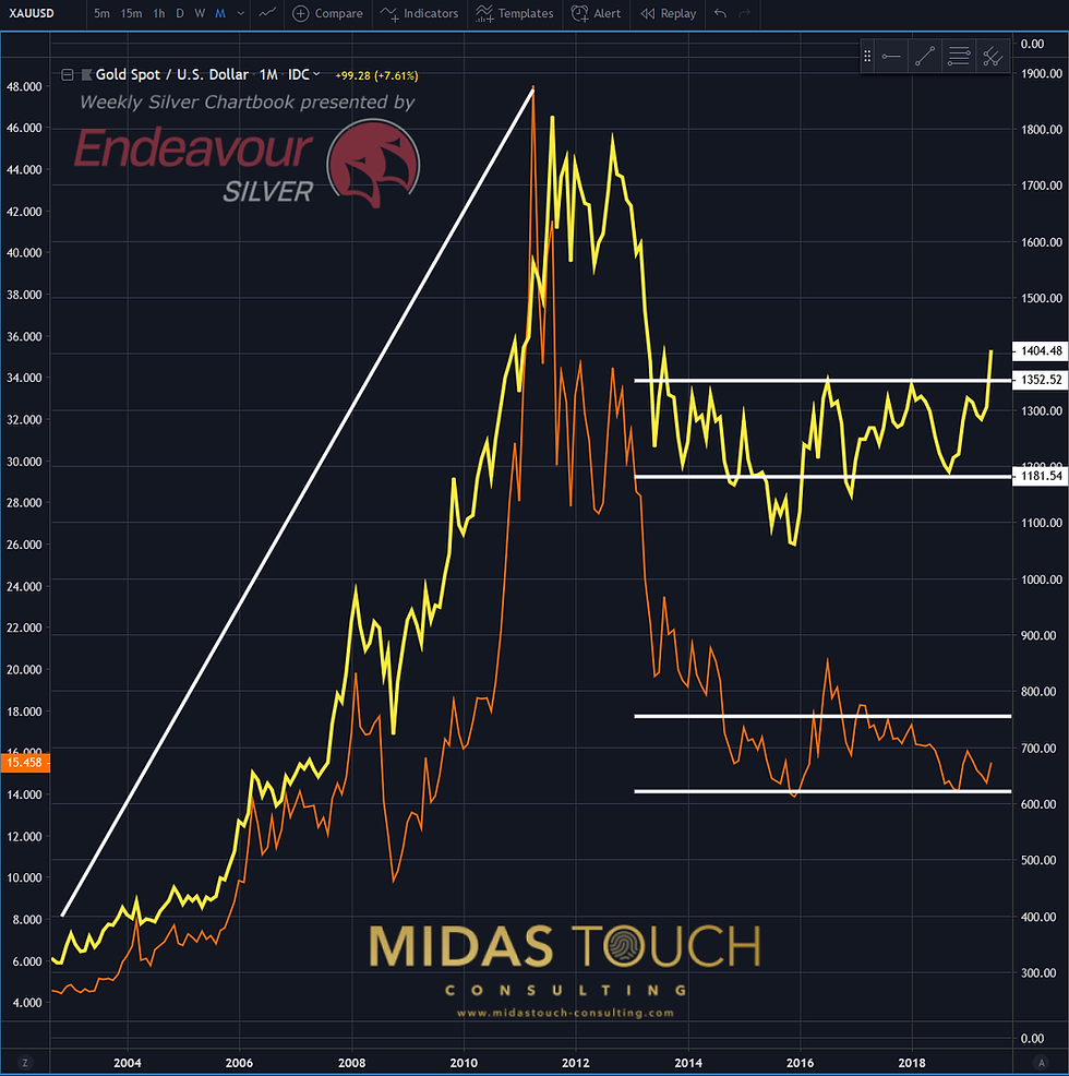 June 21st 2019, Gold (yellow line) versus Silver/US Dollar (red line), monthly chart:
