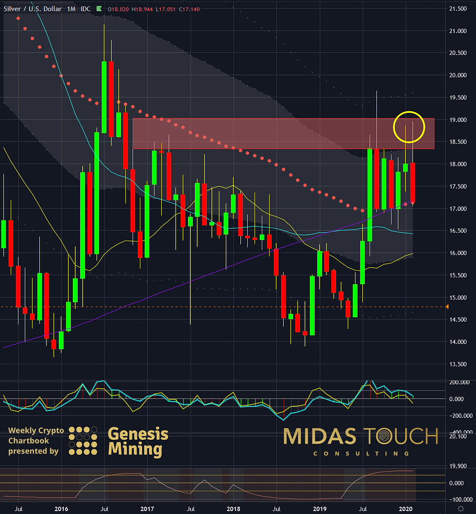 Silver in US Dollar, monthly chart as of February 28th, 2020